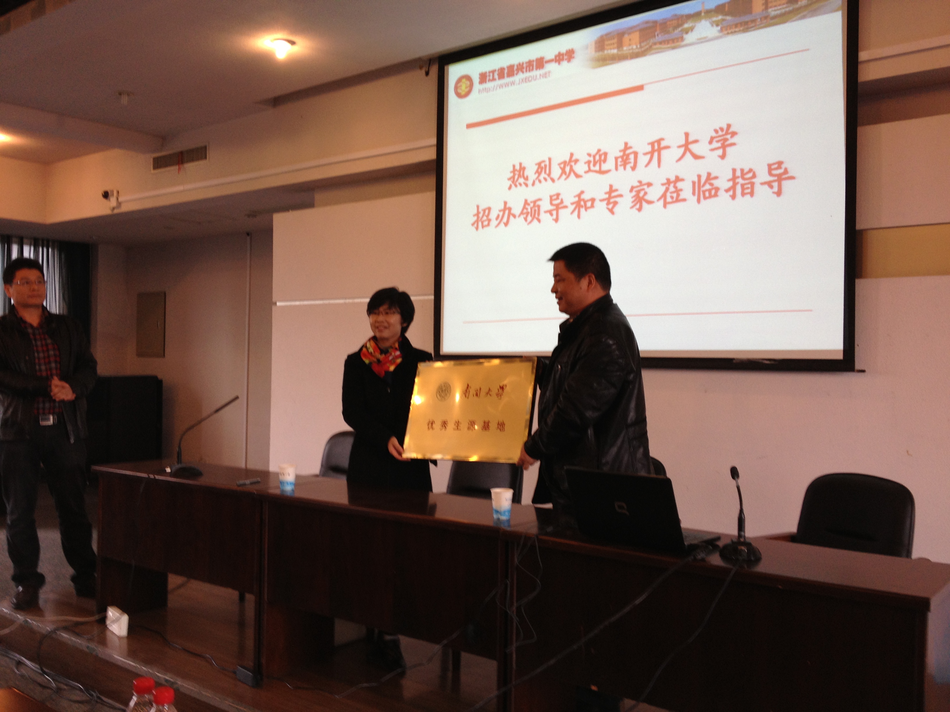 南开新闻网讯 12月3日-5日,我校招生办公室主任邵庆辉、浙江招生宣传组组长张立民教授来到镇海中学、桐乡高级中学和嘉兴一中三所学校举行优秀生源基地授牌仪式并进行了交流和访问。邵庆辉主任在会上分别向三校学生介绍了我校的办学理念、办学特色、优势学科、办学成果和招生政策,受到了学生们的热烈欢迎。邵庆辉不时地与学生互动,解答学生所关心的问题,会场气氛十分热烈。上述三所学校的校长均表示,能成为南开大学的优秀生源基地是莫大的荣幸和骄傲,衷心感谢南开的厚爱,今后将在南开大学的帮助和扶植下一如既往地培养和输送更多的优秀学生来南开深造。