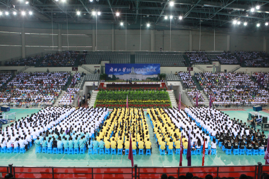 南开新闻网讯(记者 张轶帆 摄影 任永华)9月20日,南开大学2014级新生开学典礼在体育中心举行。校领导薛进文、龚克、刘景泉、张式琪、杨克欣、张亚、许京军、朱光磊、孙广平,校长助理冼国明、刘秉镰出席典礼。典礼由校党委副书记、副校长杨克欣主持。