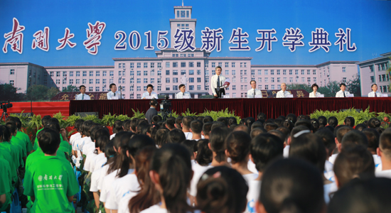 南开新闻网讯(记者 吴军辉 聂际慈 学生记者 张军 摄影 任永华 吴军辉)9月19日,南开大学2015级新生开学典礼在八里台校区与津南校区隆重举行。校领导薛进文、龚克、刘景泉、张式琪、杨克欣、许京军、佟家栋、孙广平等出席。佟家栋、朱光磊分别主持了典礼。七千余名2015级本、硕、博新生和五百余名留学生共同参加了仪式。