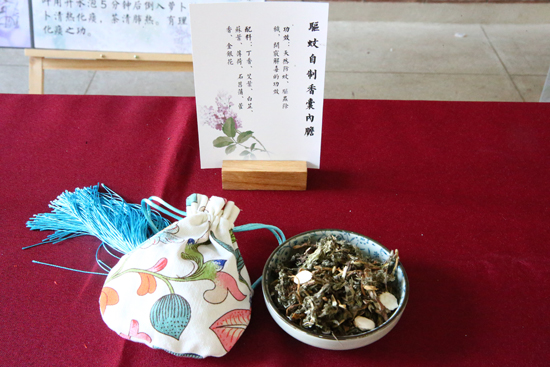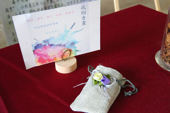 来到药香展台,一股小清新文艺之风扑面而来。不同种类的中草药按照古方配好,置于青花瓷小碟中,便于参观者试闻。成品的中药内胆则放置到清新淡雅的棉布香囊之中,配以丝绦,古朴而不失艺术。走近半步就已香气扑鼻。“防感香囊”顾名思义,可以预防流感,选用的是苍术、防风、菖蒲、藿香、佩兰等药材。而“戒烟香囊”更引人注意,选用藿香、佩兰、瓜蒌、菜菔子等配制而成,对戒烟戒酒有帮助。