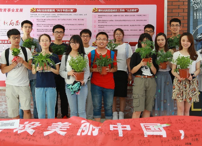 6月4日中午,在第47个世界环境日到来之际,南开大学在津南校区举办了一次以“美丽中国,我是行动者”为主题的“集赞赠绿植”活动,只要过往同学分享一两个自己在日常生活中的绿色环保小习惯或小窍门,在条幅上签上自己的名字,就可以获得环保书签一枚;如果将活动现场拍照上传微信朋友圈,让更多朋友了解此次活动,那么“集赞”较多同学就可以获赠一盆绿植。