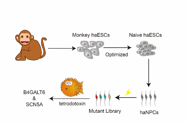 帅领研究团队将所获得的猴子单倍体神经干细胞进行高通量的全基因组随机突变,并将突变后的细胞系进行河豚毒素毒杀实验。最终,通过生物信息学分析和基因编辑实验证实,河豚毒素的关键靶点基因为B4GALT6和SCN5A。