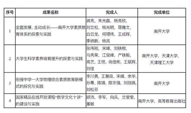 此次获奖成果涵盖素质教育体系建设、大学生科学素养培育、国家精品在线开放课程建设、大学中学素质教育衔接等方面,是我校教育工作者经过多年努力获得的创造性成果,充分反映了近年来南开大学在教学领域所取得的重大进展和成绩。其中,顾沛团队的《国家精品在线开放课程“数学文化十讲”的建设与实施》项目是我校在线课程建设的代表性成果,这已是顾沛连续第五年获得国家级教学成果奖。