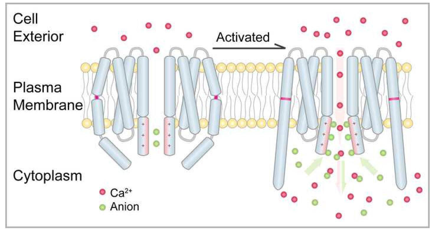 令研究人员意外的是,离子通透的疏水门控区域在激活前后没有发现构象差别,这与已经报道的其他疏水门控的离子通道十分不同。结合实验数据,该团队提出了一个新颖的钙离子通透机理。Orai通道在闭合状态下,六聚体被最外侧螺旋紧紧缠绕,使细胞质一侧的离子通透孔处于收缩状态。此时,Orai通过正电荷排斥和负离子塞子共同相互作用来阻止Ca2+通透。当Orai通道打开时,六聚体最外侧螺旋摆动,从而拉动六聚体中心的螺旋在胞内侧向外扭曲,暴露碱性氨基酸富集区,因此能够吸引并聚集负离子。这些负离子不仅可以中和通道内的正电荷以减少电荷排斥,还可以增加通道内部质膜两侧的电位梯度。在这种情况下,通道内的钙离子一方面受到细胞外钙离子的排斥作用,起到“推”的作用;另一方面又受到细胞内负电荷吸引,起到“拉”的作用。钙离子在这样的“推-拉”合力下,通过疏水门控区域,进入到细胞内。