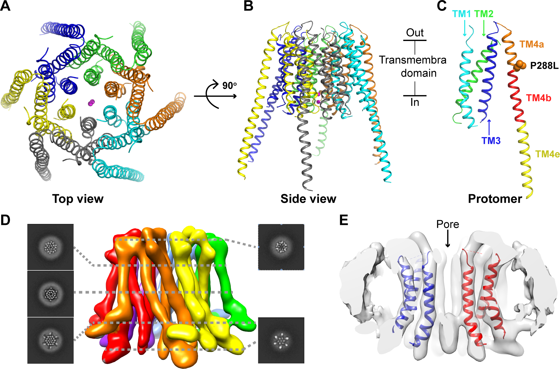 在本次的研究中,沈月全团队首先利用X-射线晶体学和冷冻电镜技术解析了激活态Orai通道的晶体结构。结构显示激活态Orai通道呈现六聚体组装。随后,通过比较闭合态和激活态的Orai通道结构,研究人员发现,通道的激活是由位于六聚体外侧的螺旋通过摆动,诱导六聚体中心的螺旋在胞内侧张开来完成的。